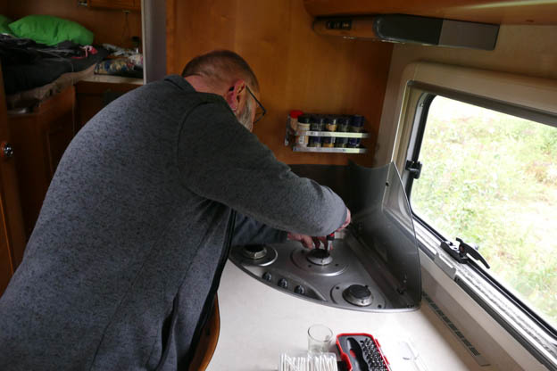Återigen fick vi användning av stegen som vi köpte när vi skulle laga läckan i taket. Det finns väldigt många slangar och kopplingar innanför sådana här luckor. Det vi kunde konstatera var att gasollågan brann med en bra låga, men något gjorde att kylskåpet inte blev kallt ändå. För att kunna komma åt att få loss brännare och allt annat där inne, behövde vi bättre verktyg än de vi hade med oss, så det var bara att försöka blåsa rent lite och skruva ihop allt igen, och konstatera att vi inte kunde fixa det.