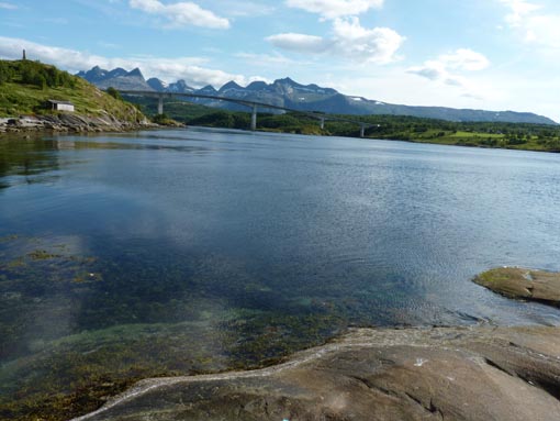 Virvlar från malströmmen, och Saltströmsbron i bakgrunden. Ramlar man i här kan man sugas ner och inte komma upp igen, fick vi höra.