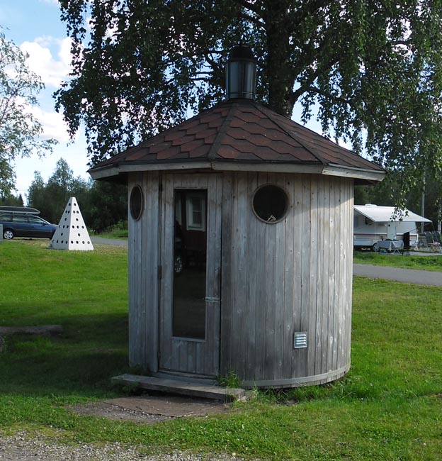 Den vedeldade bastun som vi bastade i låg precis vid servicehuset. Servicehuset var helt ok, men varmvattnet tog slut ena dagen när vi duschade. På bilden syns också en badtunna, som man fick boka i förväg för att använda. Priset för att bada badtunna vet jag inte.