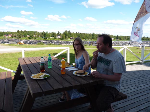På campingområdet finns det en liten grill, som passade bra för oss. Vi ville ha något enklare än det som serverades i restaurangen. Jag tog den sista renkebaben, som var liten men god. Lelle och Miranda fick nöja sig med hamburgare, som också var bra.