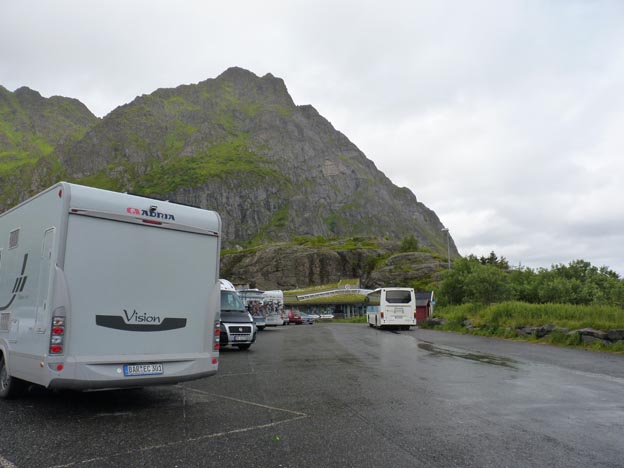 Parkeringen i Å. Här tar E10 slut. Man får vända och åka tillbaka en bit, oavsett man vill eller inte. I huset med grästak längst bort på parkeringen finns ett turistcenter, där det går att köpa diverse dyra souvenirer. De är inte så bra på att informera om campingar, sevärdheter med mera, däremot finns det broschyrer som man kan bläddra i.