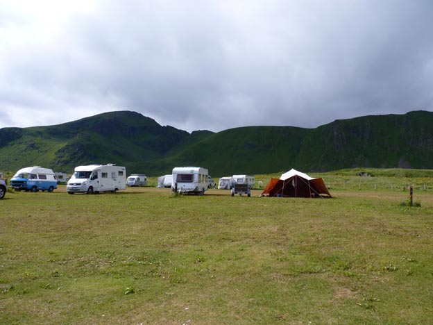 På campingens gräsmatta finns inga speciella platser, man ställer sig som man vill. Campingvärden tyckte att om man inte ville ha el kunde man ställa sig en liten bit bort från elstolparna, för att vara snäll mot folk som kom senare och inte hade så långa elkablar.