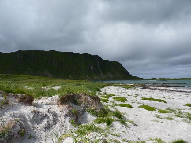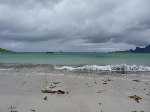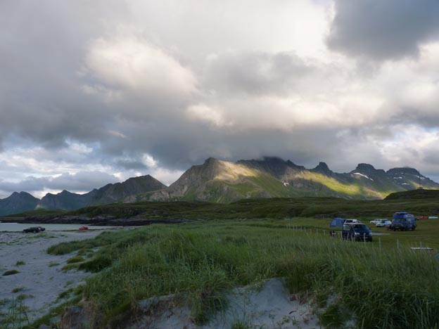 210 kr/dygn kostade det med el. Campingen ligger mycket vackert. Det är en halvstor gräsmatta som är inklämd mellan fjällen. Bara några meter från campingen ligger en större fjord, med stränder som ser ut som den perfekta badplatsen. Det skulle det säkert vara också, om det inte vore så förbaskat kallt i vattnet. Sanden är kritvit och vattnet ser alldeles grönt ut.