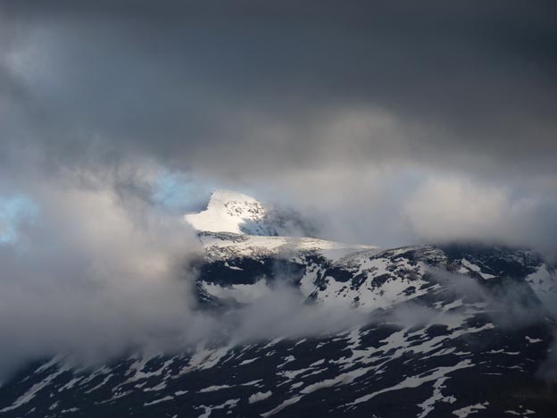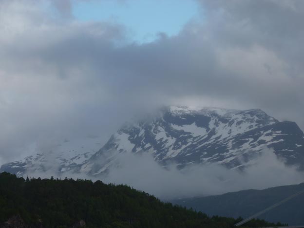 Ett snöigt fjäll såg vi också från rastplatsen, när molnen gled isär lite.