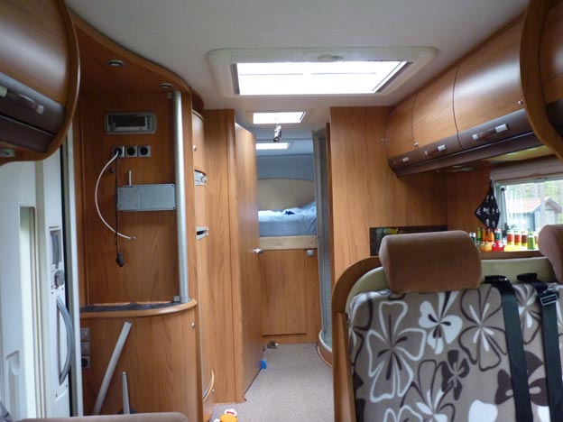 Bakåt. Längst bort är Lelles och min säng. Miranda sover i den nedfällbara sängen ovanför framsätena.