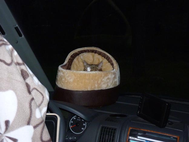 Olivia fick en ny koja. Placeringen på instrumentbrädan dög första kvällen när hon ville ha uppsikt och kontroll på allt nytt. Nu är sängen flyttad ner under soffan.