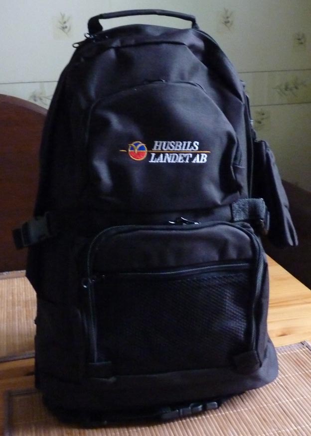 När vi åkte från Husbilslandet fick vi den här ryggsäcken.