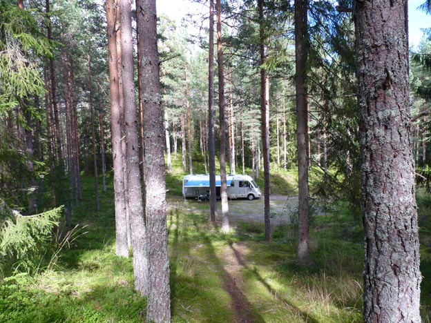Sveaskog har tagit hand om rastplatsen vid Lumsen i många år, det har funnits dass, soptunnor och till och med ved, men från och med i år har de tyvärr slutat underhålla platsen och låtit gräsmattan växa igen. Det finns några små platser kvar att stå på. Vi började campa uppe på vändplanen vid gräsmattan, eftersom det redan stod folk vid forsen. När de åkte därifrån flyttade vi dit.