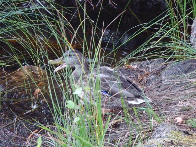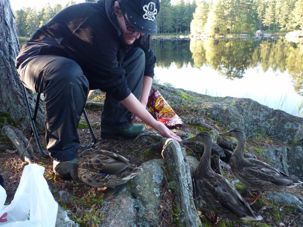Andungarna från i våras har blivit stora. De bjöd in sig på räkkalas. Vi hade tänkt använda räkorna som bete, men så blev det inte när det dök upp nio hungriga änder.