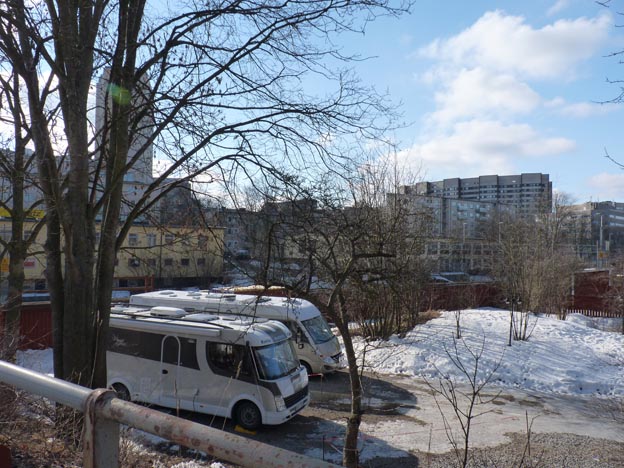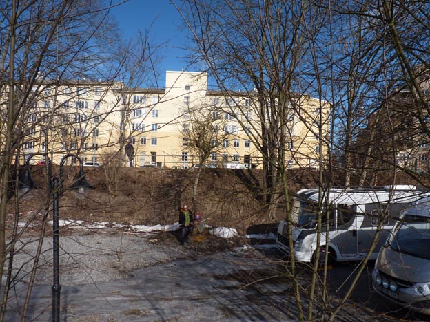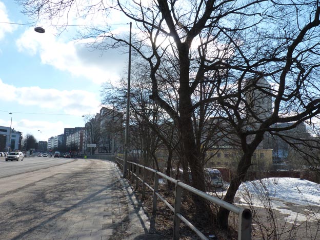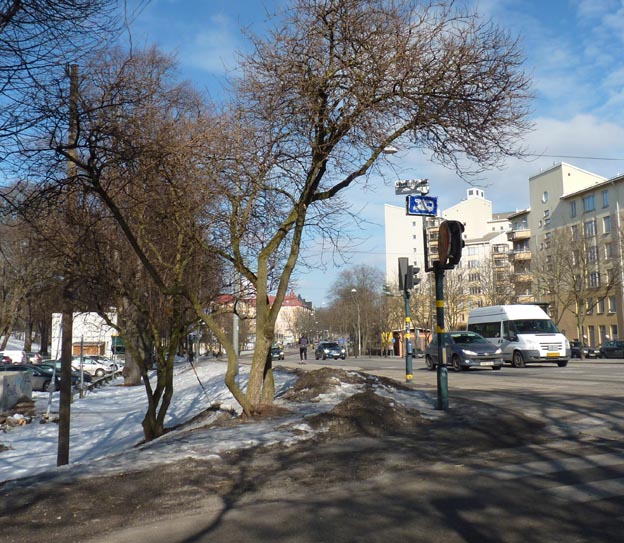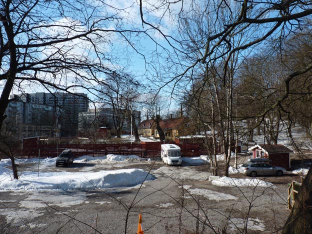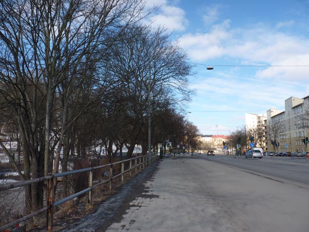 Här har vi Ringvägen. Ställplatsen ligger precis nedanför vägen, man ser gruset nere bakom träden. Utöver den vanliga trafiken kom det också en del tutande ambulanser, eftersom Södersjukhuset ligger i närheten.