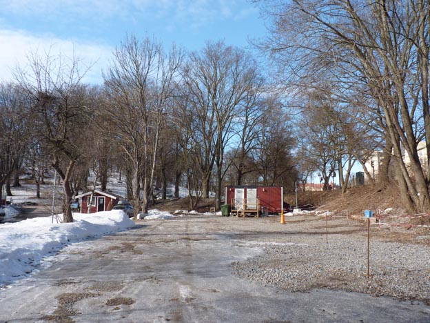 Här står jag och fotar med ryggen mot vår bil, så man ser ungefär halva platsen. Det ser ut som att det är tänkt att bilarna ska backa / köra in mot träden till höger i bild. Det blir inte mycket väg kvar att köra på, även om snön försvinner. Platserna var avgränsade med hjälp av kedjor.