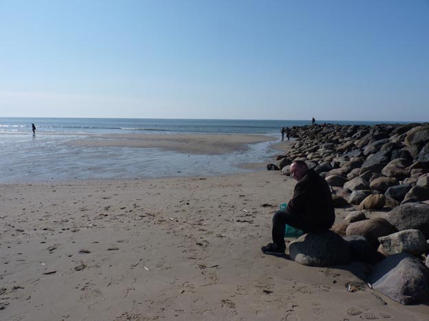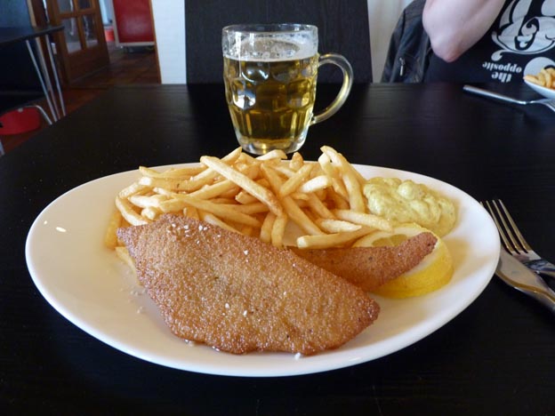 Nere vid havet fanns en grill där vi köpte fiskfilé och pommes. Det var underbart gott, förutom remoulad-såsen, den pillade jag bort. Lelle och Miranda sa att den var god. Servicen var otroligt bra även där. Ölglasen förvarades i frysen, så ölen var riktigt kall att dricka. Pris: 317 DKK för tre personer, med två öl och en läsk.