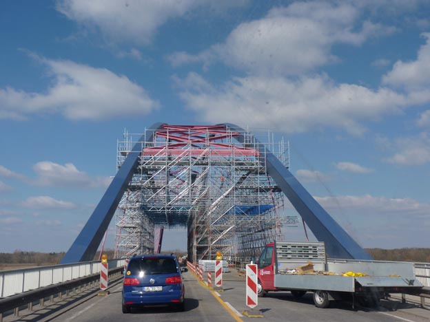 Här kan man prata brobygge. Den här bron går över floden Elbe, nära Dömitz, där vi hade tänkt övernatta. Bron är förhållandevis ny, den byggdes 1992 efter tysklands återförening, men den behövde tydligen en reparation ändå.