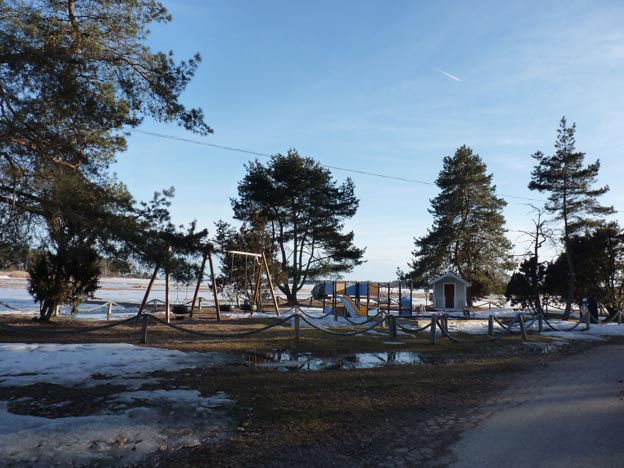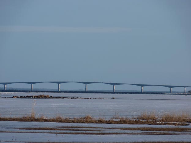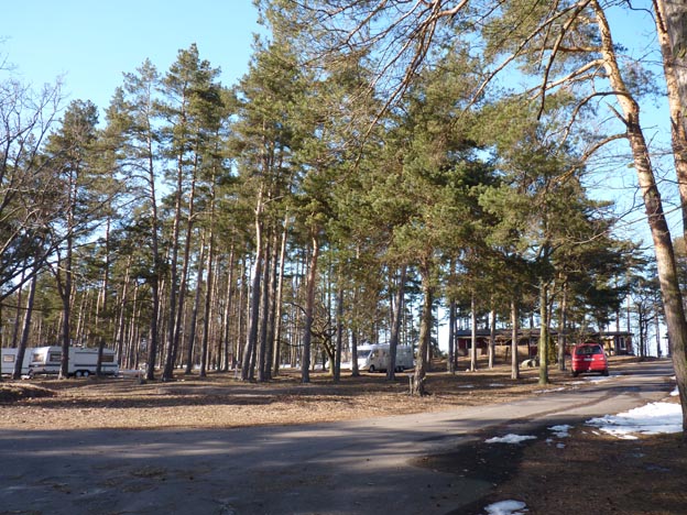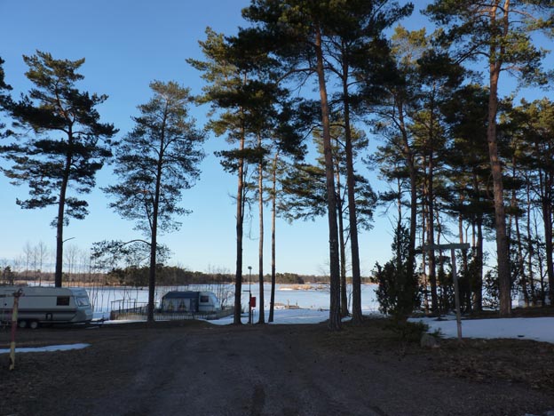 Vi bestämde oss för att stanna över natten i Kalmar. Vi åkte först in på Stensö Camping strax söder om Kalmar. Den såg fin ut, men det var mycket snö kvar. Den lilla biten av gräsmattan som hade tinat fram såg blöt och mjuk ut, så vi vågade inte köra ner där. Vi fattade rätt beslut, visade det sig. Det kom några engelsmän som åkte ner, och de körde fast efter att ha åkt en liten bit.
