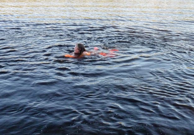 Jag och Eira slängde av oss vinterpälsen på fredagen. Det var inte varmt i vattnet, det kan jag lova, men det var ändå skönt. Särskilt när jag kom upp igen. Det är tur att man inte bottnar, då slipper man sega sig i. Det är bara att kliva ner i djupet, innan man hinner känna kylan. Nu är det gjort, ca två veckor tidigare än förra året.