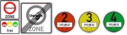För att få köra bil (både husbil och personbil) i de tyska städer som har infört miljözoner måste man ha ett klistermärke som man fäster på bilens framruta. Om man inte har dekalen får man inte köra i zonen, och man riskerar både böter direkt på plats och bärgning ut ur zonen. När vi var i Tyskland i påskas hade vi inget sådant märke, vi visste inte att det behövdes. Jag blev nyfiken på vad de där skyltarna som satt överallt betydde, så jag tog reda på det när vi kom hem. Vi hade väl tur som inte blev stoppade, antar jag.