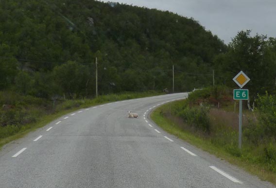 Vi började med E6, som inte var i så bra skick. Strax efter Lakselv satt det sex varningsskyltar i tät följd: dålig väg, kurvig väg, spårig väg, smal väg, varning för ren, och varning för får. Vi råkade ut för allt.