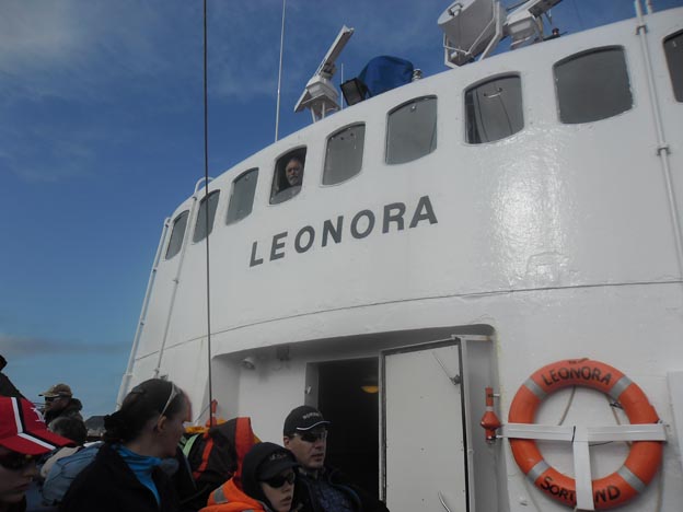Kapten på M/S Leonora var Helge, som har varit kapten i 30 år. Valsafarikapten hade han varit sedan 2009. Han såg ut som en riktig kapten, med tatueringar och guldring i örat. Man ser hans ansikte på bilden nedanför när han tittar ut ur fönstret.