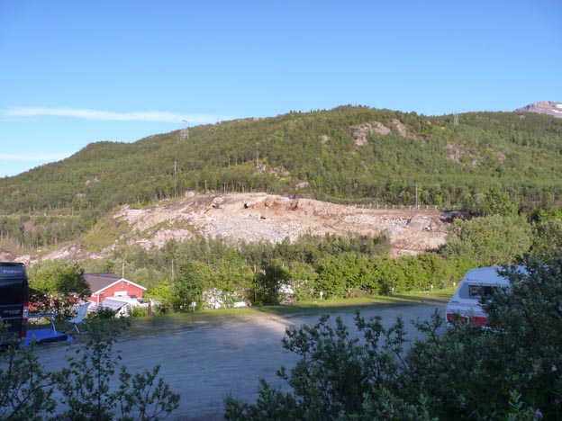 Precis bredvid campingen går E6, som var ordentligt trafikerad runt Narvik. Vi hörde bilar hela natten. En bit upp på berget går järnvägen, där det kom både tomma och fulla godståg. Ofta. Narvik är en stor knutpunkt. På eftermiddagen och kvällen hörde vi dessutom grävmaskiner som arbetade i berget bredvid.