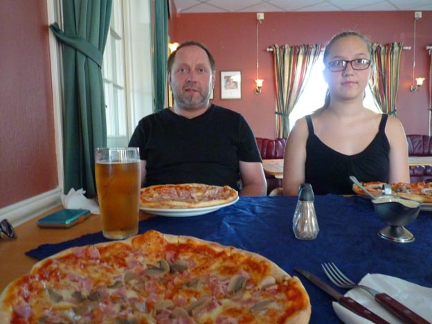Vi slog på stort och åt i restaurangen. Det var gott, men dyrt. 115 Nok för en pizza som inte var så stor. Tre pizzor, två öl och en läsk gick på 530 Nok.