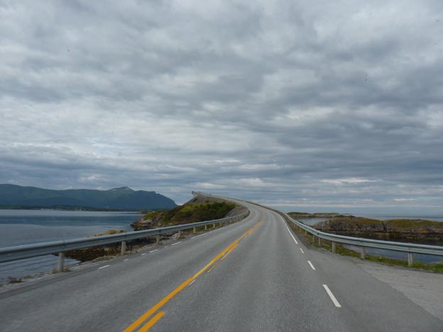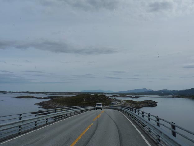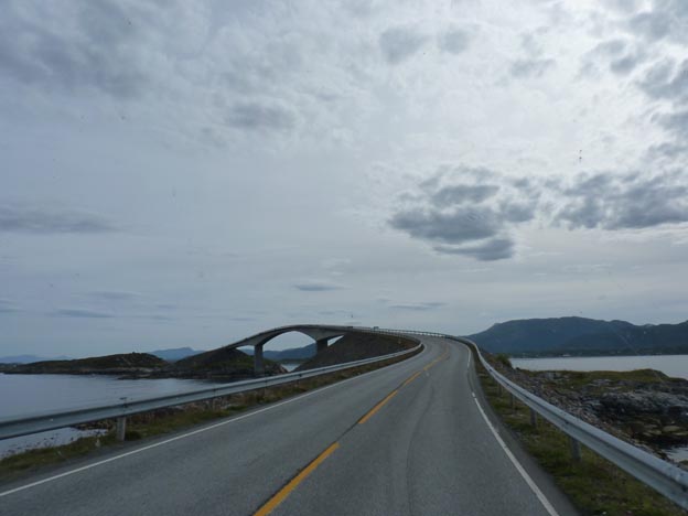 Visst är det vackert, det kan jag hålla med om, broar, vatten och hav i kombination kan vara vackert, men särskilt speciellt vet jag inte om jag tycker att det är. Det finns ju broar och vatten överallt i Norge, och kusten ser ut som en kust vid Atlanten brukar göra. Jag får inte den där hisnande känslan av Atlanthavsvägen, helt enkelt. Det är fint, men inget mer. Nu när vi har åkt vägen fram och tillbaka två gånger får det räcka.