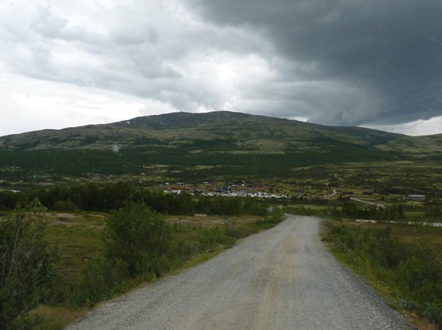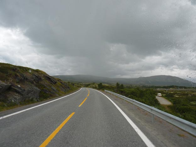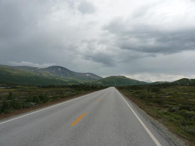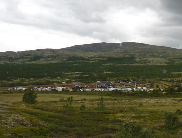 Väl ute på E6 igen fortsatte vi söderut över Dovre. Den naturen tycker jag är vacker. Vi hade tänkt fricampa på Dovre, men de flesta platserna var upptagna redan. Det fanns några lutande platser precis bredvid vägen, dessutom började det regna, så vi ville ha en camping i stället. När man är ute så länge är det bra med el så man kan driva ut råheten som blir i bilen när det regnar.