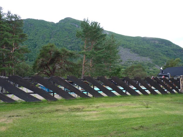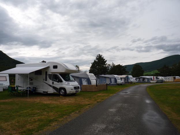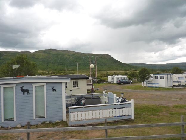 Till slut var vi lite fräcka och trängde oss in bredvid några säsongare som inte var hemma. Det fanns lediga eluttag vid den enas staket, så vi använde det. Senare på kvällen kom det en norsk småbarnsfamilj på genomresa, de hade samma bekymmer som oss, och dessutom barn som skulle sova (vi hörde trafiken fast vi kom bort en bit från vägen), så vi lyckades klämma in dem också där (vilket gjorde att säsongarnas förtält blockerades helt).