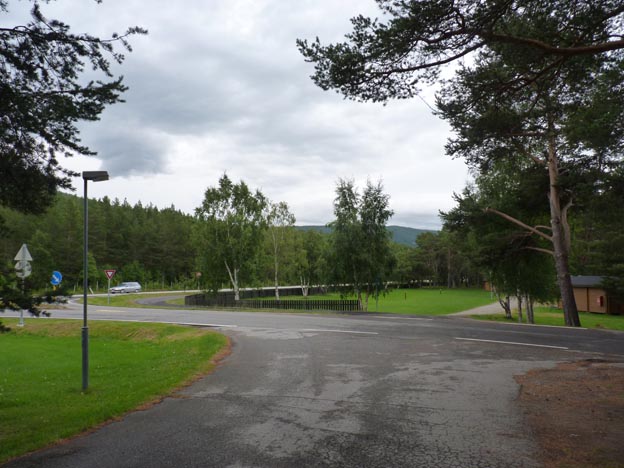 E6, landsvägen, vägen in till campingen, och så en tom gräsmatta med elstolpar.