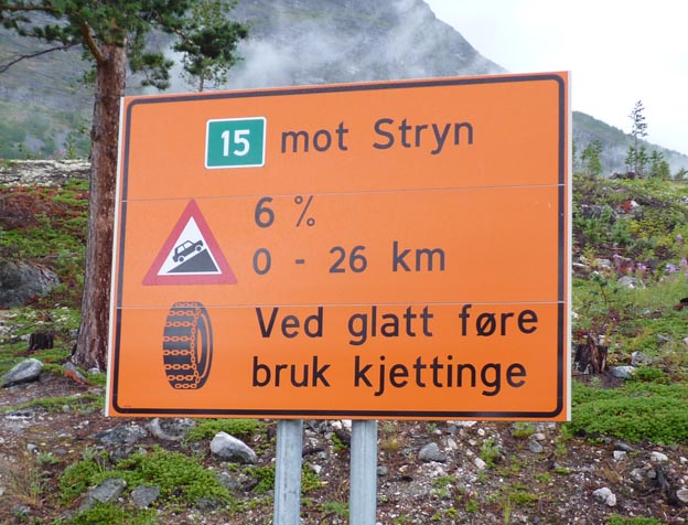 Vid Grotli svängde vi av från väg 15, och valde vägen över Strynfjället istället. Det är en turistväg som har nummer 258, och kallas Gamla Strynefjellsvegen. Som högst går den 1139 meter över havet. En liten bit in på vägen fanns en öppen bom, och en stor skylt där det stod att vägen var förbjuden för husvagnar och fordon över 13 meter, men det gällde ju inte oss, vår husbil är ju bara 9 meter, och vägen såg bra ut, så vi åkte. Om man inte vill åka över fjället fortsätter man bara på väg 15, man kommer till samma plats.