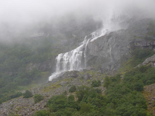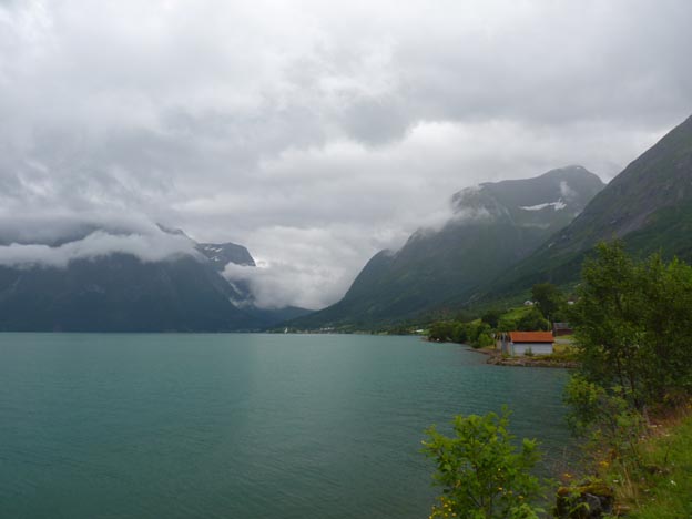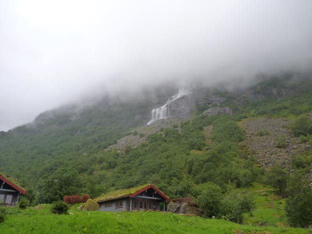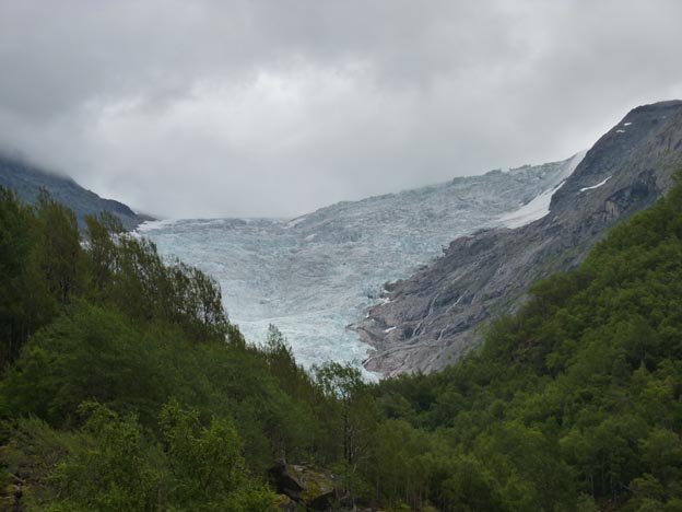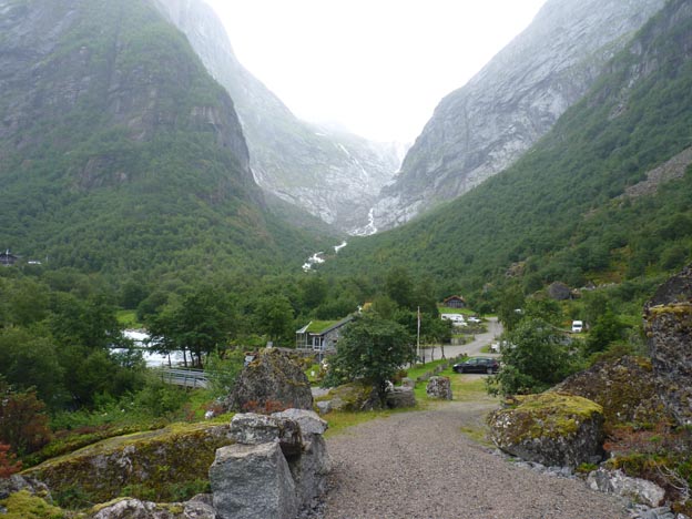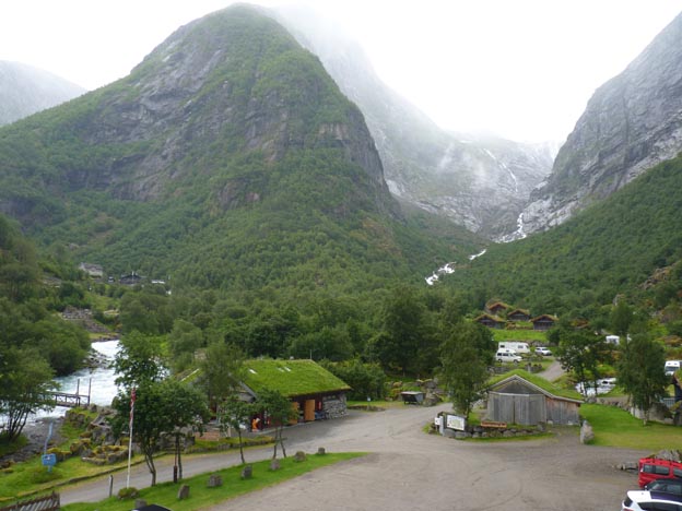 Briksdalsbreen. Vi hade tänkt gå dit på kvällen, men det var dimma och lite regn i luften, så vi avvaktade och inväntade morgondagen istället.
