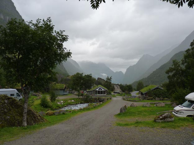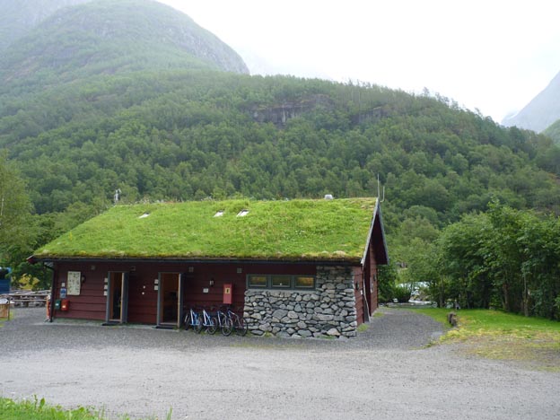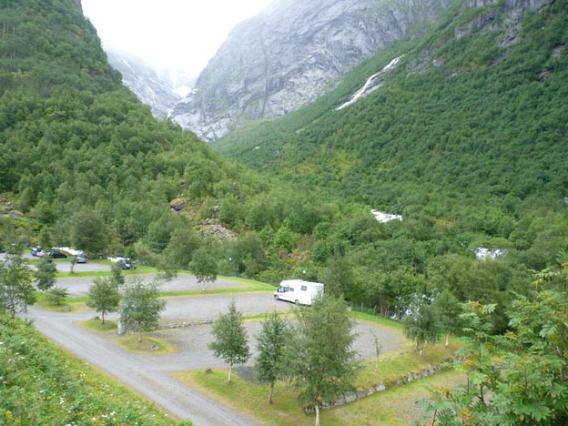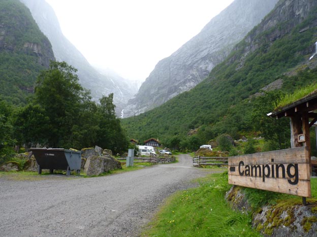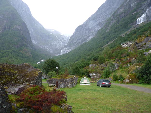 Campingen heter Melkevoll Bretun, och ligger som sagt väldigt nära Briksdalsbreen (namnet på glaciären). Den har 50 elplatser, som ligger utspridda över ett ganska stort område. Med tanke på hur terrängen runt omkring såg ut, måste de ha lagt ner ett jättejobb med att få till platserna. Hela campingen var mycket fin. Den kostade 110 Nok / natt, + el 30 Nok, + 30 Nok / person, totalt 230 Nok.