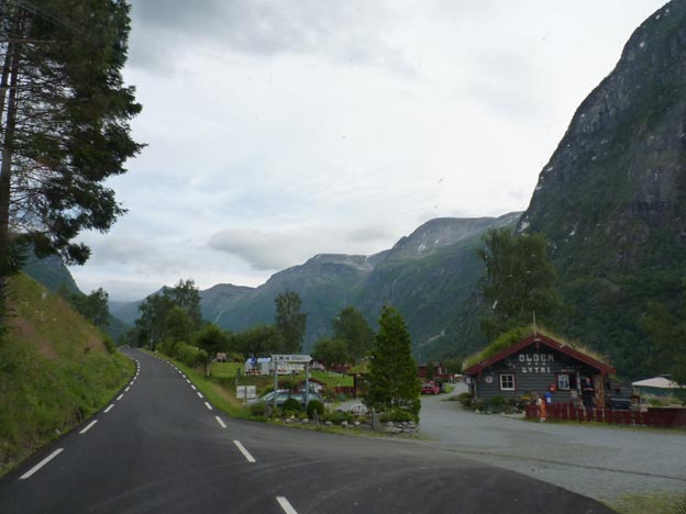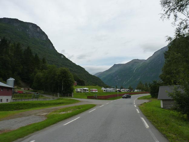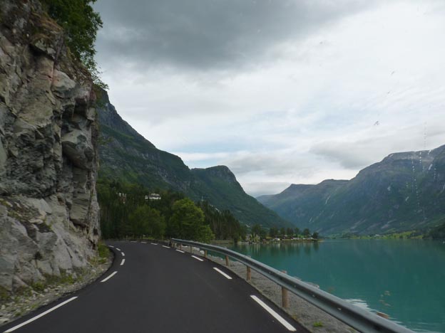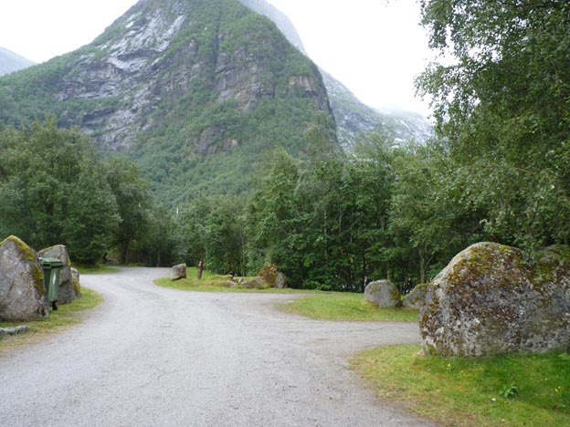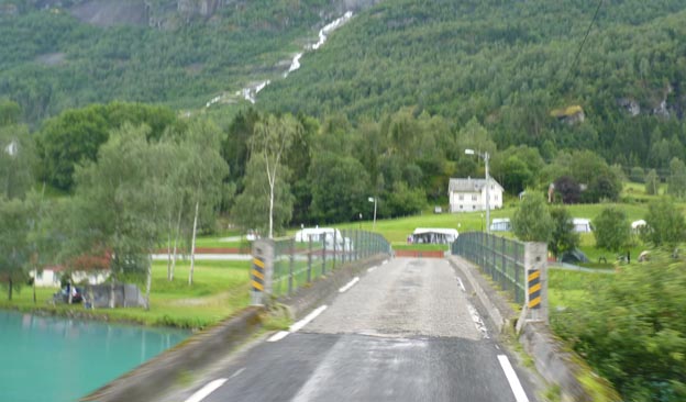 I Olden svängde vi in på en onumrerad väg, som även den var smal. Vi ville se en glaciär på nära håll, och efter lite googlande och sökande i campingkataloger hade jag hittat en camping som låg 45 minuters gångväg från Briksdalsbreen, en del av Jostedalsbreen. Den campingen siktade vi på. Jag gissar på att vägen var så här smal i ca 2,5 mil.