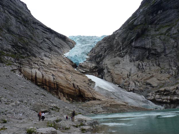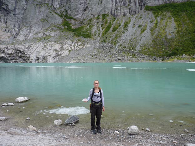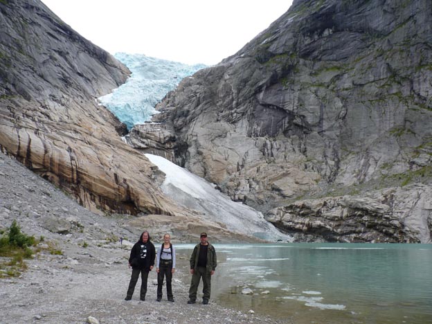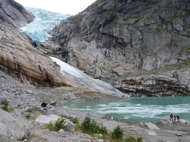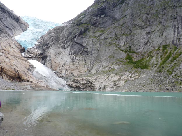 Framme vid Briksdalsbreen! Nedanför själva glaciären fanns det en sjö, full med smältvatten.