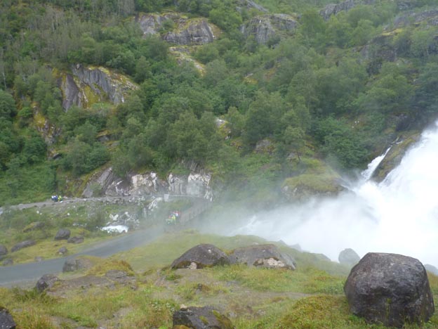 Vålefossen är stor. Mycket stor. Och den låter. Mycket. Man hör forsen dygnet runt på campingen, men det gör inget. Vi hörde några kraftiga dunsar ifrån forsen, och trodde att det var stenar som rasade, men det var det inte. Det är bara vattnet som slår mot berget. Förr i tiden använde de dunsarna för att spå väder. Ju högre smällar, desto mer regn och oväder var det på gång.