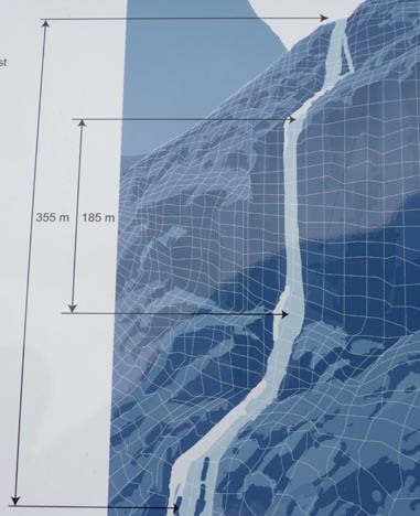 Den blå färgen på glaciären beror på att isen är så kompakt, så den absorberar allt annat ljus i spektrat. Blå är den ända färgen som inte absorberas av isen, och därför ser den blå ut. Detta läste vi på en av informationstavlorna som fanns.