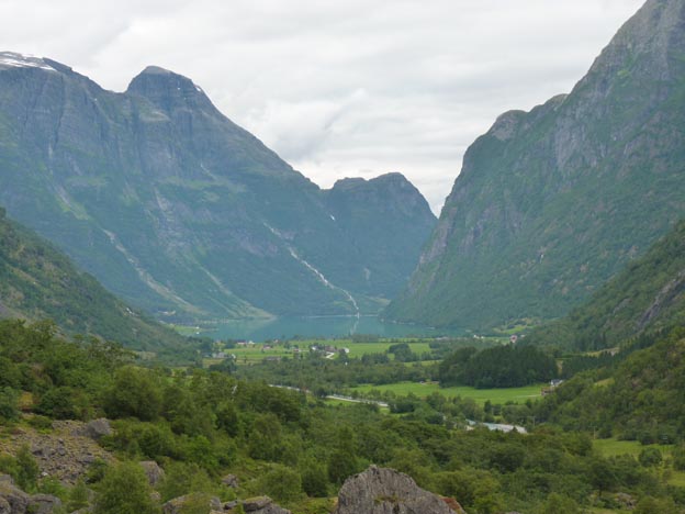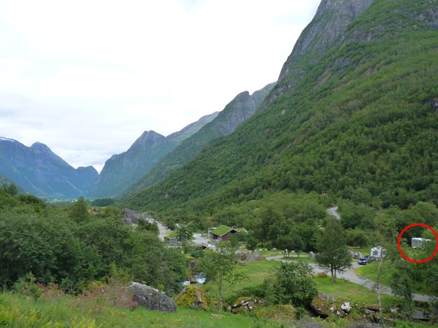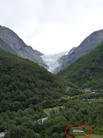 På kvällen tog vi en kort promenad till en utsiktspunkt på campingen. Därifrån såg vi både forsen och Briksdalsbreen, och dessutom Melkevollsbreen (på bilden här ovanför), dalen nedanför oss, campingen och vår ”lilla” husbil (inringad i rött på bilderna).