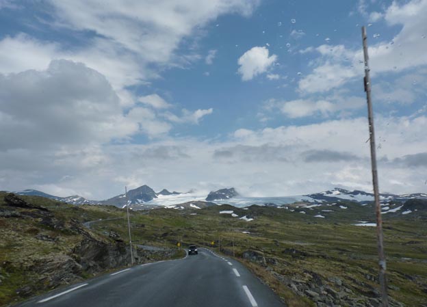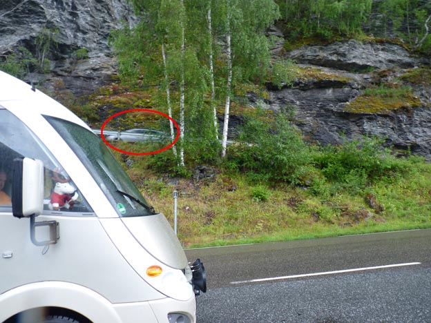Här har vi åkt några mil på väg 55, den nationella turistvägen som går över Sognefjället. Vi såg att vi skulle få möte i kurvan och svängde in på en lite större mötesplats för att vänta in mötande trafik. De som körde om oss fick problem. Vi satt och väntade och log medan de andra försökte komma överens om vilka som skulle backa. Alla ville tydligen åka först.