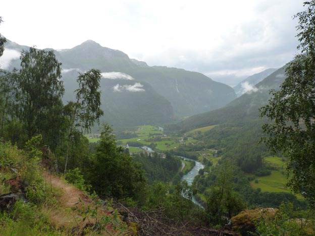 Utsikt ner över dalen när vi har kommit halvvägs upp i hårnålskurvorna.