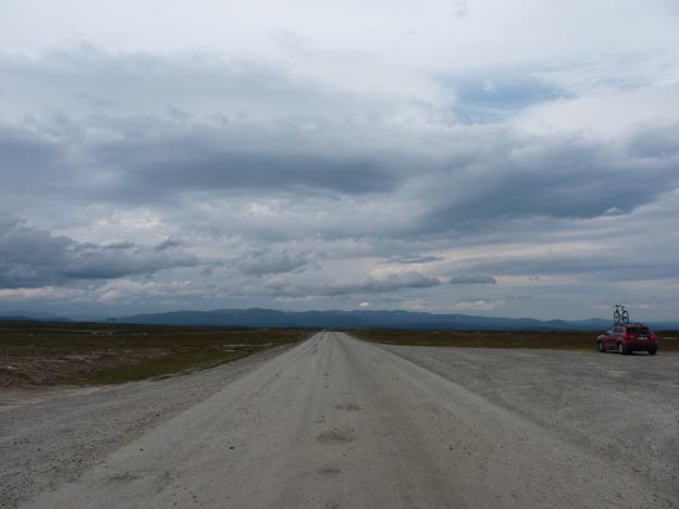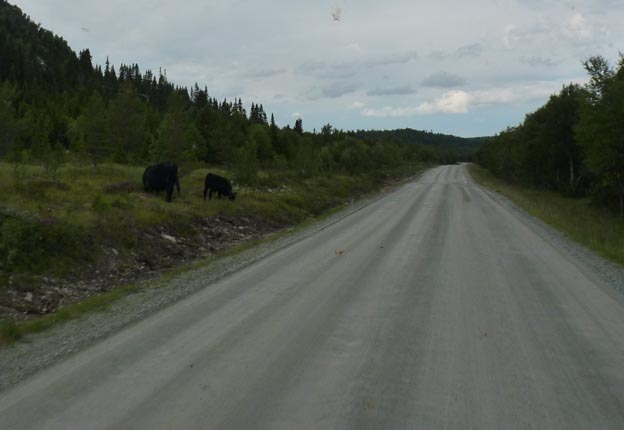 Bättre väg i Sverige? Nej, inte över Flatruet i alla fall. Vi åkte fram till Funäsdalen och svängde in på den här vägen. Grusvägen var i mycket dåligt skick, även för att vara grusväg. Det fanns inga får på vägen, som det kan göra i Norge, på svenska sidan gränsen gick det kor i stället.