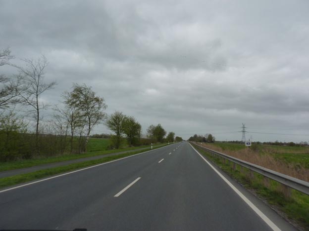 Många av de tyska landsvägar vi har åkt på är bra. De är raka och bra att köra på, men det har varit mycket långtradare på landsvägarna också. Vi åkte mot nordväst, förbi Jever, och tänkte svänga söderut i Aurich, men det gick inte pga vägarbete. De är väldigt bra på att skylta i god tid om att det är trafikomläggning i Tyskland, däremot är de extremt dåliga på att tala om vart man ska ta vägen istället, så vi hamnade i Emden, där vi också körde vilse ett tag pga ytterligare en trafikomläggning. Vi hittade ut ur stan till slut, tog oss söderut till Autobahn 28, och därefter mot Holland.