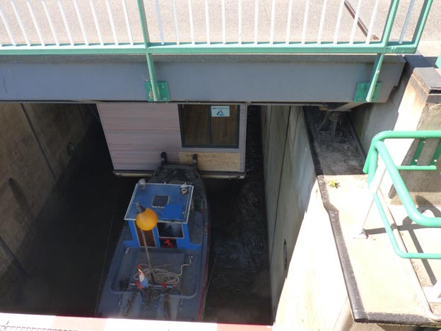 Här håller de på att fylla vatten i slussen. Det var en båt som bogserade ett hus, och en båt som sköt på huset bakifrån.