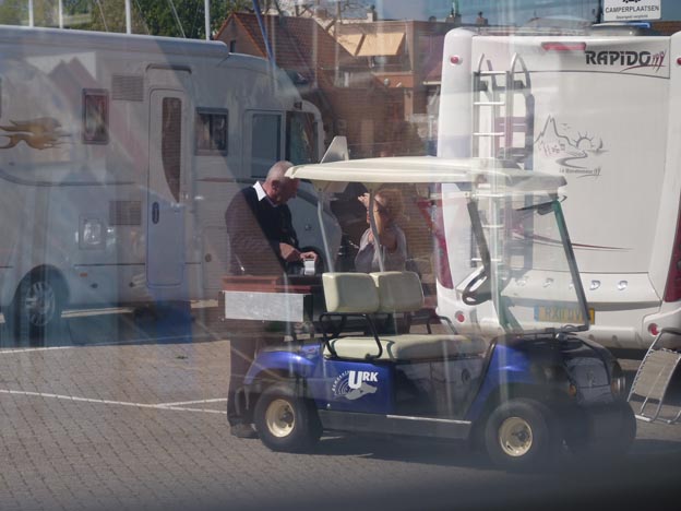 Redan klockan 15.00 började ställplatsen bli full, det verkar vara en populär plats. Det kostar 15 € att stå där i ett dygn. På skylten stod det 13 €, men den måste ha varit gammal. Vi fick en turistbroschyr där det också stod 15 €. Hamnvärden kom lite då och då och samlade in kontanter av nyanlända, och körde bort folk som hade parkerat utanför ställplatsen. Han kom inte på några bestämda tider, verkade det som. Han var den enda holländaren som vi mötte som inte var särskilt trevlig.