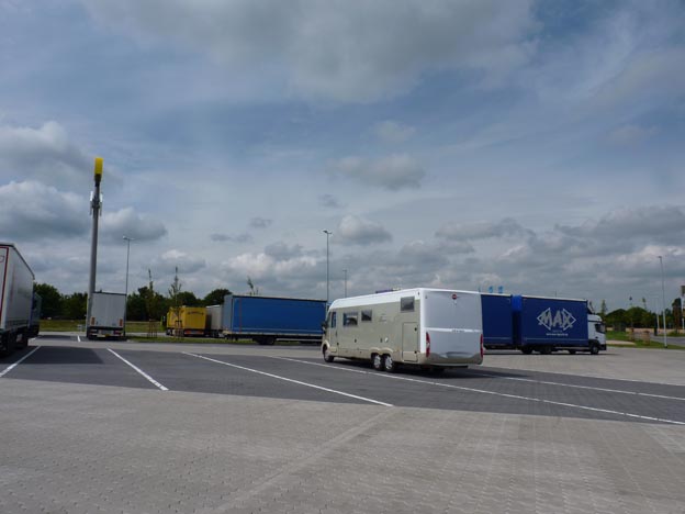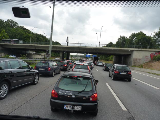 Före Hamburg var det bilkö, i vanlig ordning. Jag förstår inte vart problemet ligger, egentligen. Det är många bilar som ska igenom tunneln under Elbe, men det finns så många filer i vardera riktning så trafiken borde flyta lite bättre åtminstone. Ca 1,5 timme stod vi i kö innan vi kom in i tunneln. På helgerna är det bättre, för då är det inte så många långtradare.