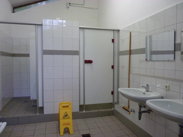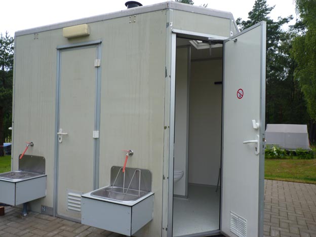 Uppe på ängen fanns det både toalett och dusch i den här lilla byggnaden, som var ren och fräsch. Man kunde tömma spillvatten, men inte toan, det fick man göra i det riktiga servicehuset.