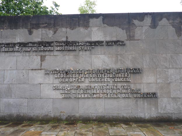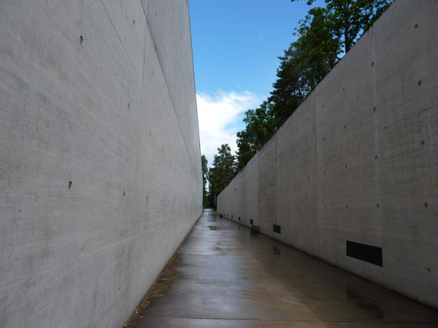 På väg ut från utställningen går man genom den här gången ut mot gravplatserna och minnesmonumenten. Precis bredvid lägret ligger det ett militärt övningsområde. När vi var där hade de övningar med granater eller något, det smällde hela tiden. Det gjorde besöket ännu mer effektfullt. Det kändes i magen att gå mellan murarna och höra smällarna, kan jag lova.