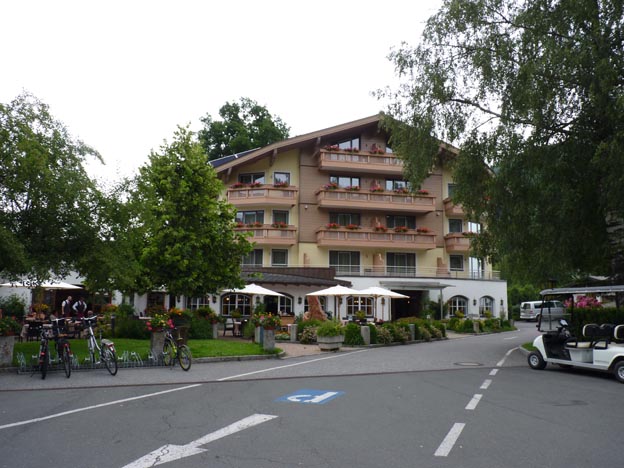 Framme vid Woferlgut Sportcamp i Bruck, nära Zell am See. Där fanns både camping, stuguthyrning och hotell. Det här är inte vår typ av camping egentligen, den var alldeles för stor. Den lilla vita bilen till höger i bild användes för att ledsaga campinggäster som skulle långt in på campingen, så de skulle hitta sin plats. Vi fick en karta och fick klara oss själva, för våran plats låg inte så långt in.