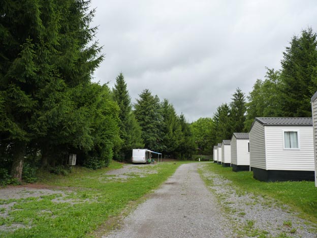 Tyngre husbilar fick stå på grus på en egen del av campingen, granne med några av stugorna som hyrdes ut. Det fanns massor av stugor och rent-a-tent med holländare i.
