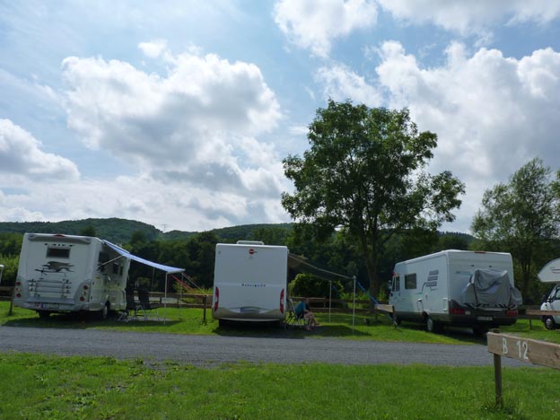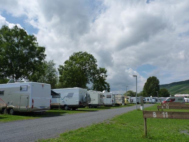 Wohnmobilpark Sun-Park i Graach. En mycket bra ställplats. När vi kom fram mitt på dagen var receptionen stängd, men det fanns bra skriftliga instruktioner om hur man skulle gå till väga, så vi åkte in och parkerade, och väntade på att incheckningen skulle öppna. Platserna var numrerade och markerade med små trästaket. För att vara en ställplats var de både långa och breda, stora husbilar var inga problem.
