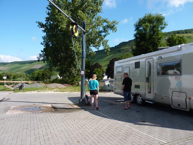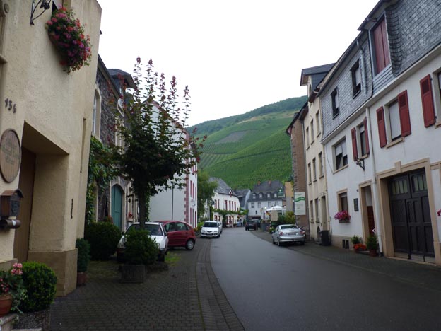 Vi hade sett en fin ställplats i Graach, några kilometer norr om Bernkastel-Kues, så vi letade efter någon plats att vända på, och åkte tillbaka dit. Det visade sig vara ett mycket bra val. Bernkastel-Kues var väldigt turistigt, det var mycket folk. Vi ville ha lite lugn och ro, och det fick vi på ställplatsen en bit bort. Den låg i och för sig nära stora vägen (som inte är så stor), men det var inget som man stördes av. På kvällen var det nästan ingen trafik alls.