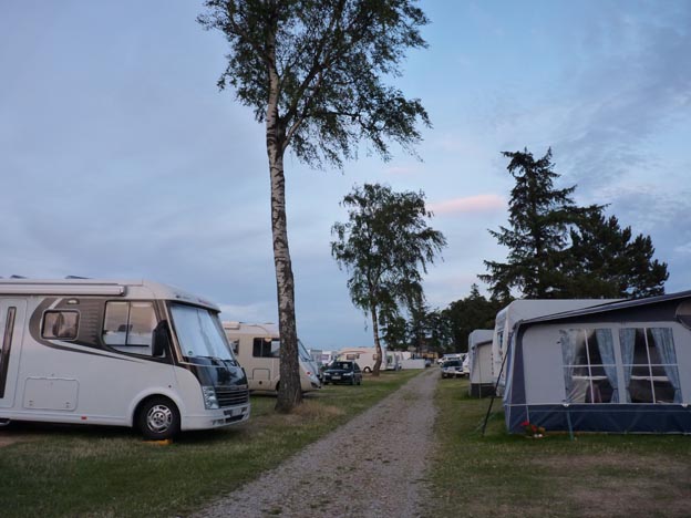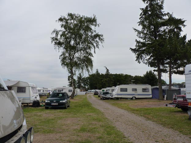 Så här ser en typisk trång dansk camping ut. Det var inte lätt att backa in en lång bil på rätt plats, vägen var så smal så det var svårt att svänga utan att köra in i grannen mitt emot och på platsen bredvid.